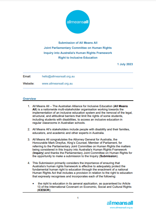 Submission of All Means All to the Parliamentary Committee Inquiry Into Australia’s Human Rights Framework, July 2023
